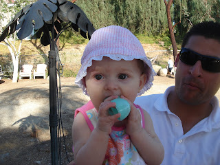 Now will I play with him you ask? Some day. For the first time last week I hit a couple balls at the range with him. It is an awkward sport and takes time to find a comfortable stance, but it can grow on you (well some of you at least). It may just grow on me as well, and i have a good teacher. One thing is for sure, he is more than excited to teach Connor to play. He has taken her to Golfsmith many times and taught her how to hold the club already... of course she holds it and brings it straight to her mouth. So in closing, I am married to a golfing mad man. He is doing so well and Connor and I can't wait to cheer him on (quietly of course) on the sidelines at a tournement soon enough.
